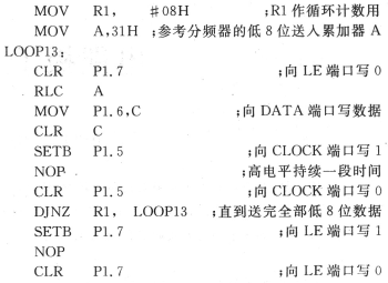 單片機P1.5,P1.6,P1.7三個I/O口分別與芯片CLK,DATA,LE相連。圖5給出了數據輸入的時序圖。數據(DATA)在每個時鐘(CLOCK)的上升沿從MSB(最高有效位)開始依次寫入24位移位寄存器中,直到LSB位寫入完成之后,由來自LE的上升沿將存儲在24位移位寄存器中的數據一次性鎖存入目標寄存器(包括R計數鎖存器、N計數鎖存器、功能鎖存器以及初始化鎖存器),再進行下一個目標寄存器的初始化。寄存器賦值順序為R-C-N,目標寄存器的選擇由移位寄存器最末兩位DB0,DB1來決定,其中C和N寄存器的賦值時間間隔應大于5 ms。