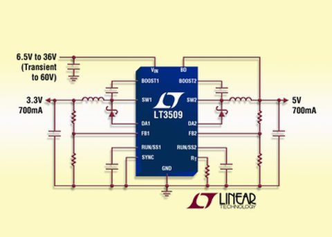 2009年2月10日-北京-凌力爾特公司(Linear Technology Corporation)推出雙通道電流模式PWM降壓型DC/DC轉(zhuǎn)換器LT3509,該器件具有兩個內(nèi)部36V、1A電源開關(guān),采用14引線3mmx4mm DFN或MSOP-16E封裝。每個通道能提供高達(dá)700mA的輸出電流,效率高達(dá)88%。其3.6V至36V的寬輸入電壓范圍以及達(dá)60V的瞬態(tài)保護(hù)使該器件非常適用于調(diào)節(jié)種類繁多的電源,包括未穩(wěn)壓的交流變壓器、24V工業(yè)電源和汽車電池。就汽車應(yīng)用而言,LT3509的3.6V最低輸入電壓使它能夠以低于4V的輸入工作,這對滿足汽車“冷車發(fā)動”需求極為重要。類似地,該器件的36V連續(xù)輸入能力加上60V瞬態(tài)保護(hù)使它能夠承受在負(fù)載突降情況下出現(xiàn)的瞬態(tài)。LT3509的300kHz至2.2MHz開關(guān)頻率是用戶可編程的,使它能夠最大限度地提高效率,而且可使用纖巧、低成本電感器和陶瓷電容器,從而產(chǎn)生低和可預(yù)測的輸出紋波。