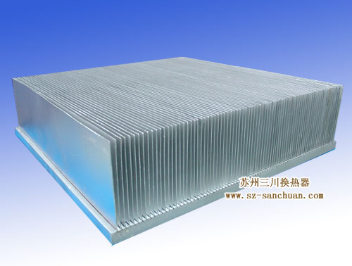 鋁制釬焊插片式散熱器是將片狀散熱片插入開了槽的基板上焊接而成。目前本公司插片散熱器的間距為1.25~6mm,散熱片厚0.6~1.2mm。該產品適合于提供大批量或大規格的散熱器生產。